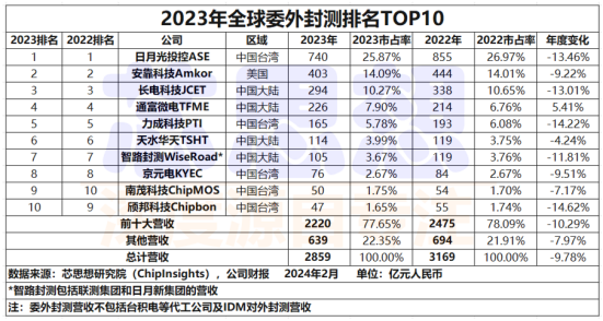 根據芯思想研究院數據,2023年全球TOP10委外封測(OSAT)中,中國大陸有四家(長電科技JCET、通富微電TFMC、華天科技HUATIAN、智路封測WiseRoad),市占率為25.83%,較2022年24.92%增加0.91個百分點。其中,僅有通富微電2023年營收實現同比增長3.92%,歸母凈利潤均大幅下滑。2024Q1長電科技、通富微電、華天科技營收、凈利潤實現大幅增長,其中通富微電歸母凈利潤大幅提升2064.01%,顯示著封測行業下行周期結束、觸底反彈有望持續好轉。